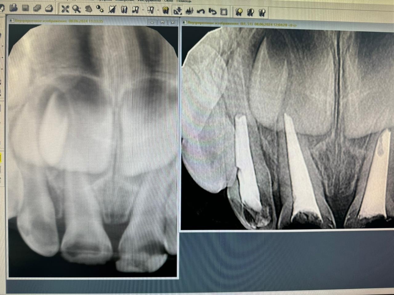 🔹В данной ситуации мама обратилась с жалобами на разрушенные зубки у ребенка, боль и отказ от пищи. На рентген снимке – глубокие кариозные полости.