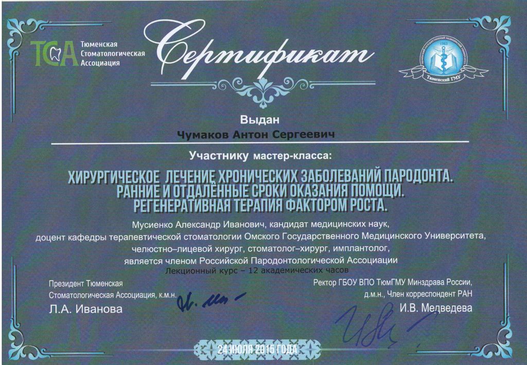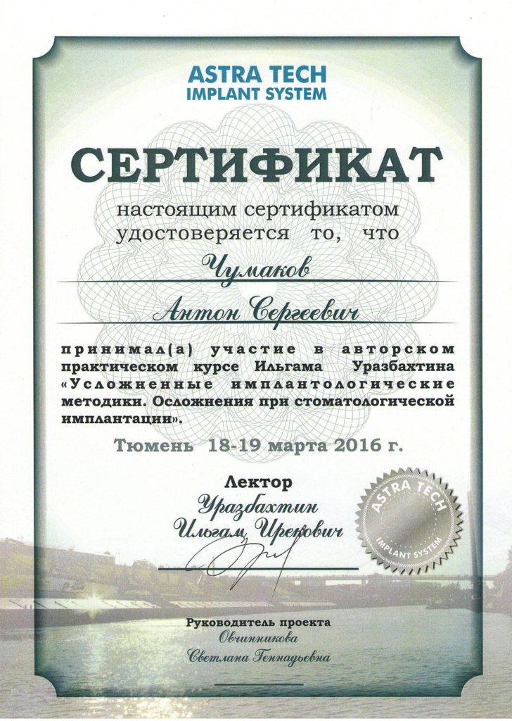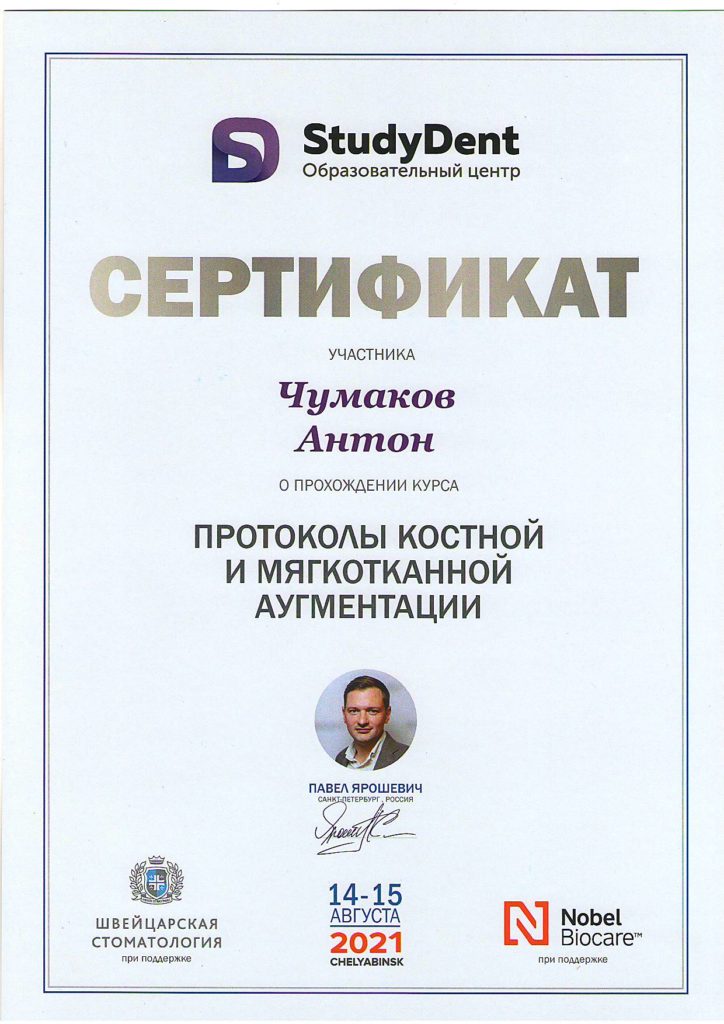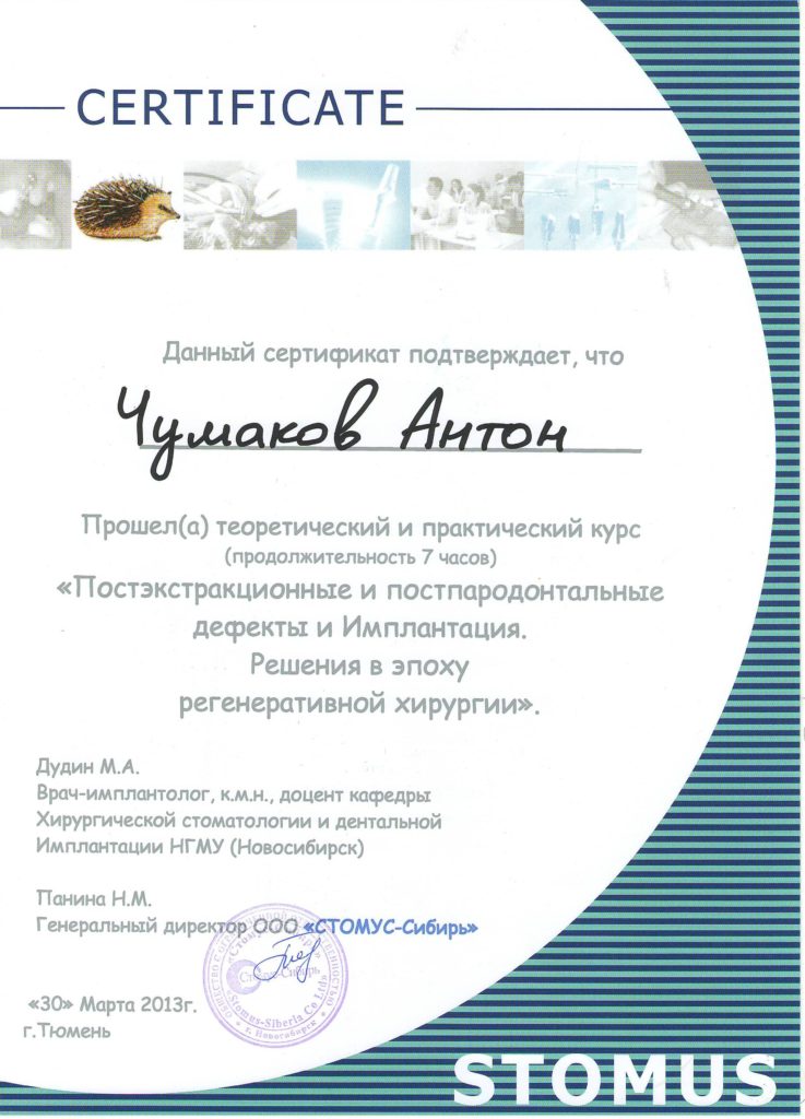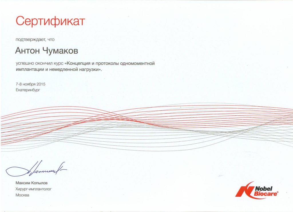 Чумаков Антон Сергеевич, внимательный, отзывчивый доктор, готов идти на встречу! Очень боялась делать импланты, но теперь всем советую этого доктора, мастер своего дела. Операция прошла быстро, безболезненно и восстановительный период прошел быстро.