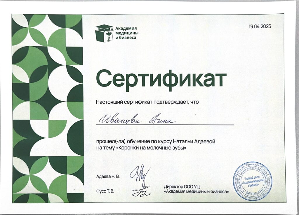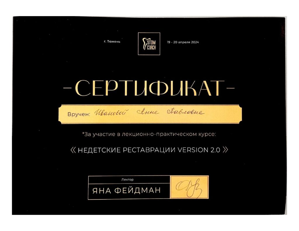После череды поиска «своего стоматолога» для младшего ребёнка, мне порекомендовали этого чудесного специалиста. Иванова Анна Павловна. Вылечила все больные зубы сына, и после лечения он и я остались безумно довольны). Спасибо Вам огромное за Ваш труд и нервы)))