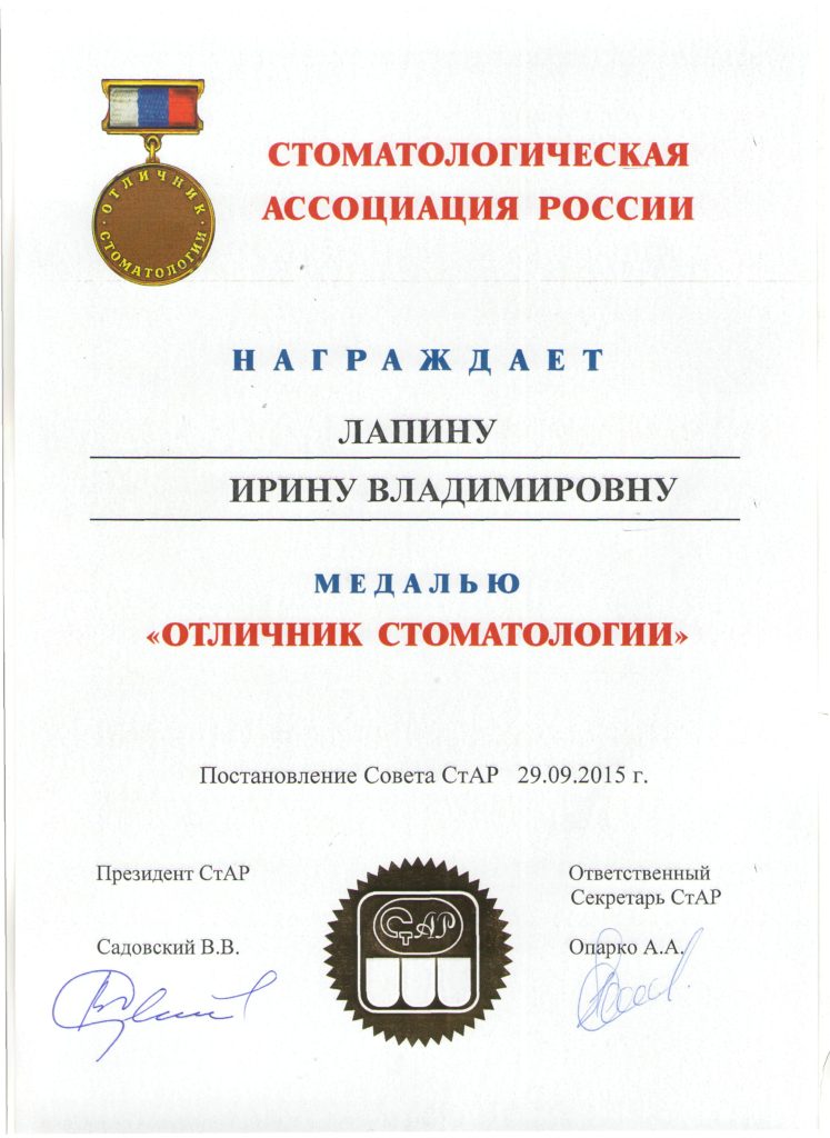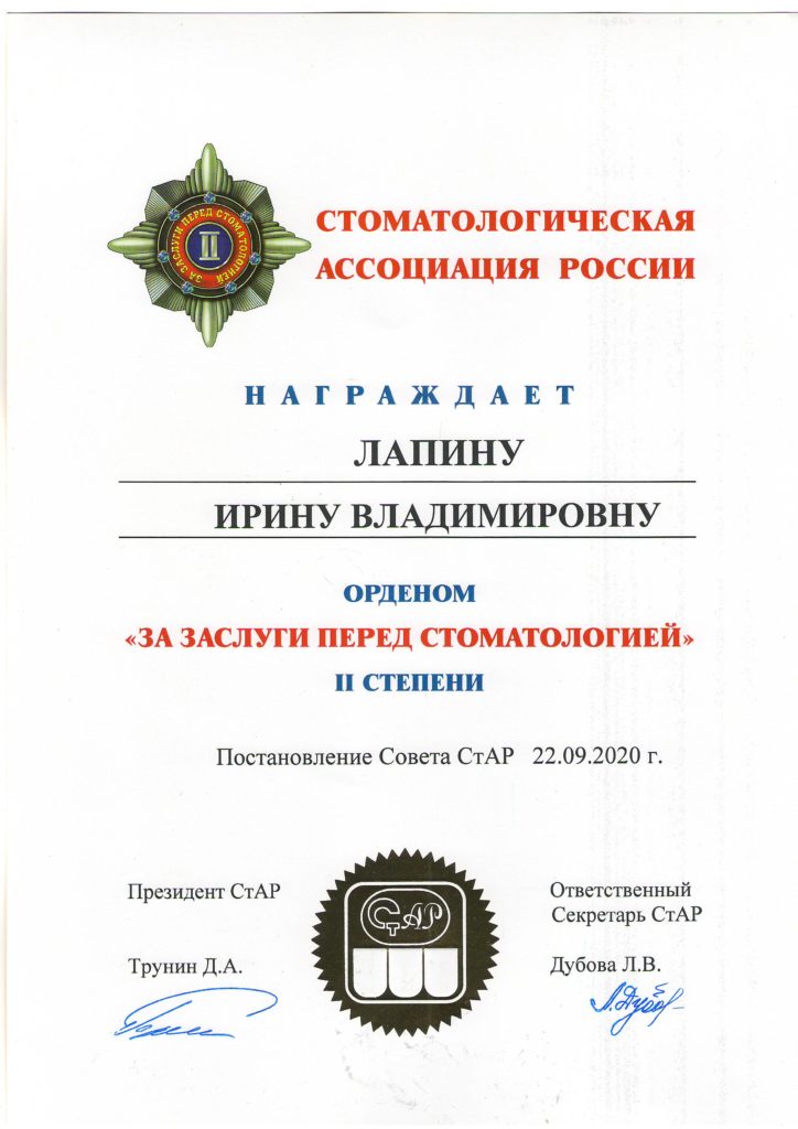 Награждена орденом «За заслуги перед стоматологией» II степени