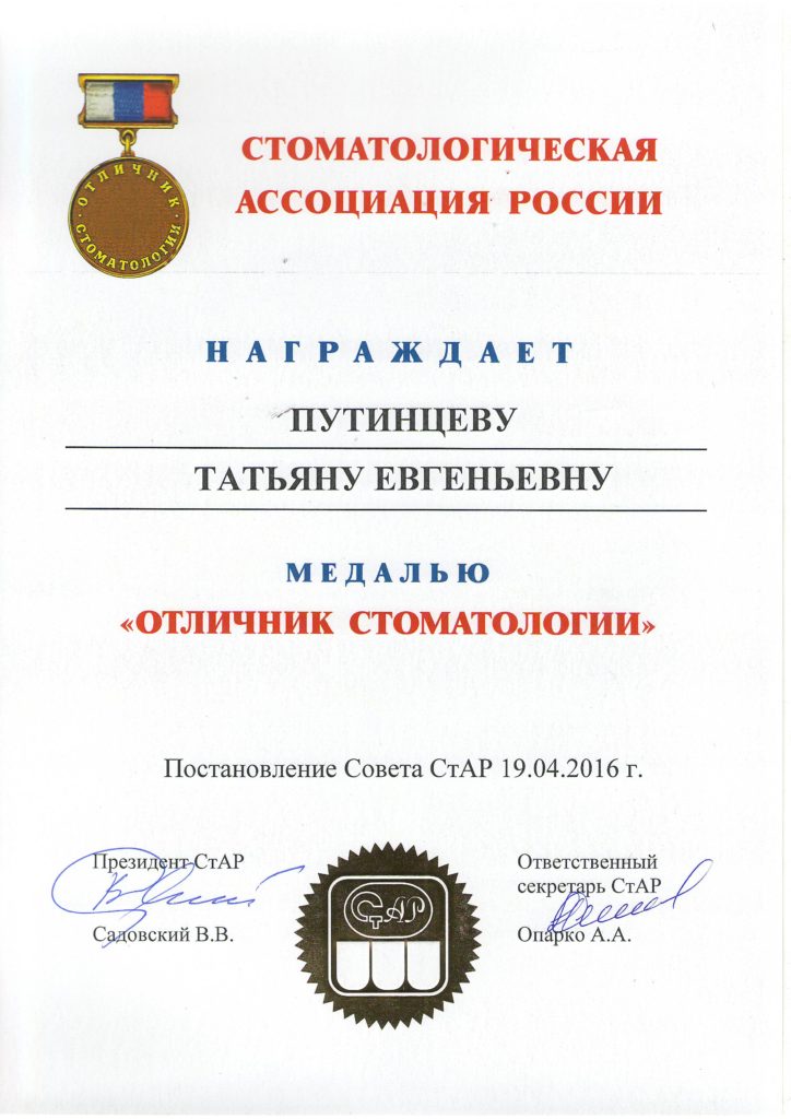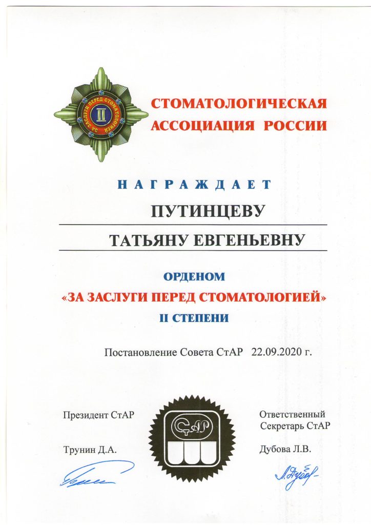 Награждена орденом «За заслуги перед стоматологией» II степени.