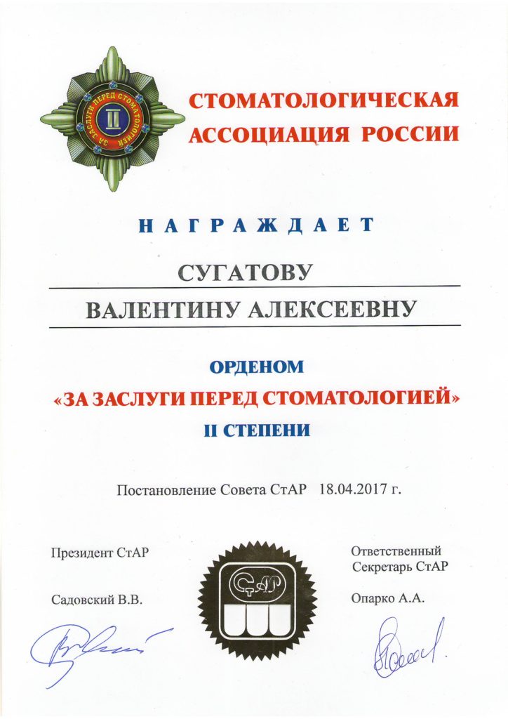 Награждена орденом «За заслуги перед стоматологией» II степени.